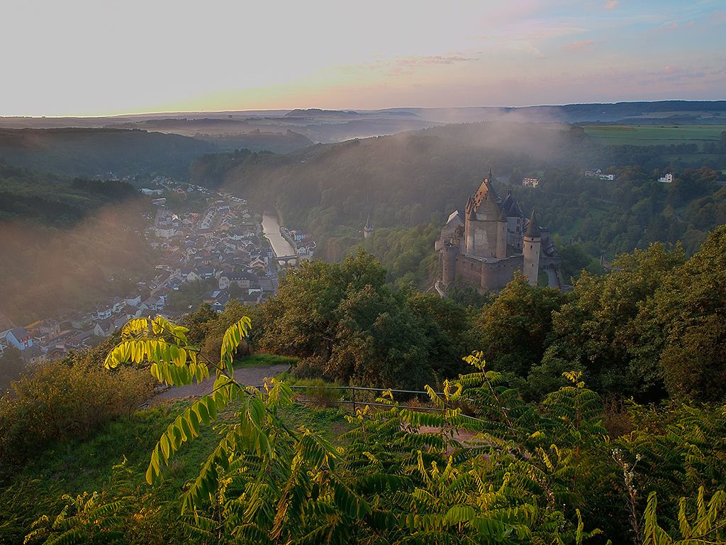 Die Nat‘Our-Route 5 startet im mittelalterlichen Vianden, etwas südlich der sehenswerten St. Rochus Kirche, die deutlich von der Staumauer überragt wird. Ihr wendet euch bergaufwärts in Richtung des wiederaufgebauten Schlosses von Vianden, eine der bedeutsamsten und mächtigsten Burgen Europas. Das Schloss ist allemal einen mehrstündigen Besuch wert. Jetzt lasst ihr es links liegen, gewinnt über Serpentinen rasch an Höhe und erreicht die Bergstation des Viandener Sessellifts. Von hier geht es nun etwas gemütlicher durch lichten Mischwald zur Bildchenkapelle, von der aus ihr eine herrliche Aussicht über die aufgestaute Our und ihr Tal habt. Bergab umrundet ihr die aus dem Berg ragende Turbine 10 und erreicht die „Ourdall-Promenade“, der ihr bis zur blauen Brücke hinter Bivels folgt. Hinter der Brücke seid ihr nun auf deutschem Boden. Bergan führt ein Waldweg zum Felssporn, auf dem die Ruine Falkenstein thront. Die Burg kann nicht betreten werden, allerdings bietet ein kleiner Pavillon vor dem trutzigen Eingangsportal bezaubernde Dornröschen-Romantik mit Burgblick.