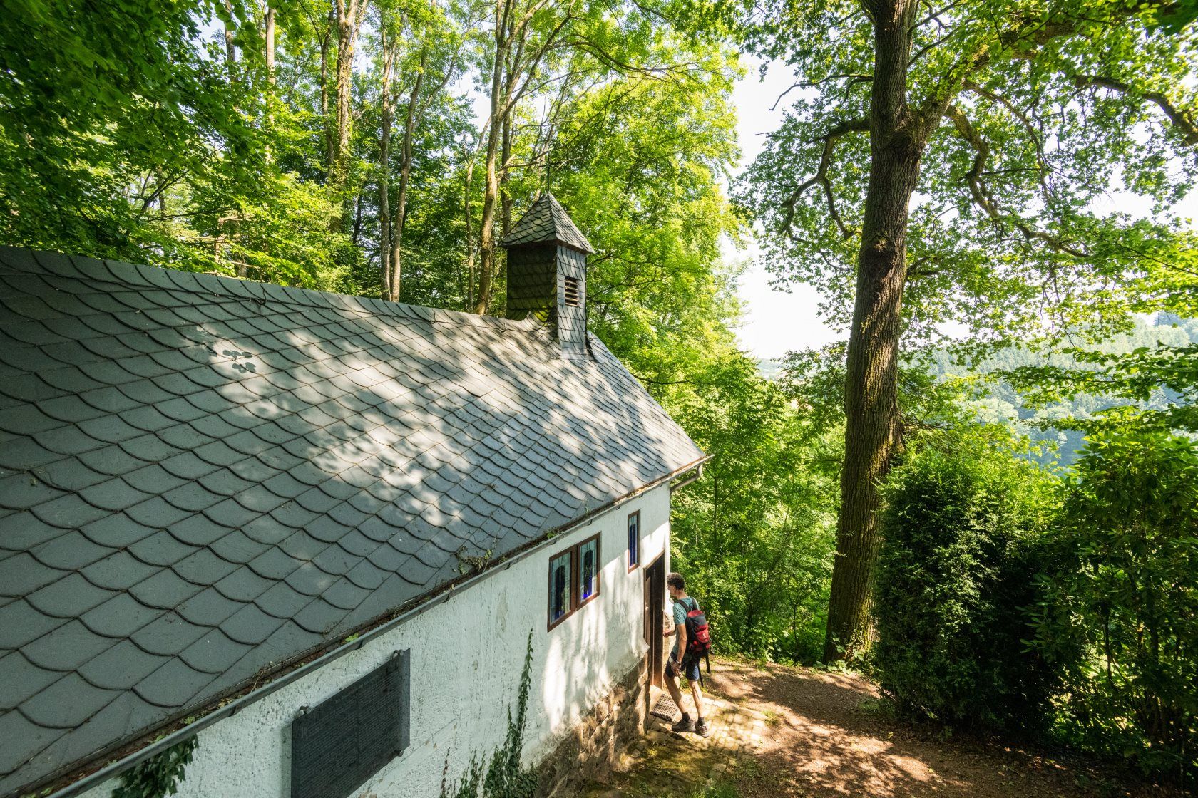 Euer erster Muße-Platz wird die einstige Einsiedelei im Bergwald sein. Hier steht die kleine Kapelle, die Bruder Antonius errichtet hat. Das Buch aus Buchenholz erinnert an den Eremiten und auf einer Tafel wird er seine Geschichte erzählt.