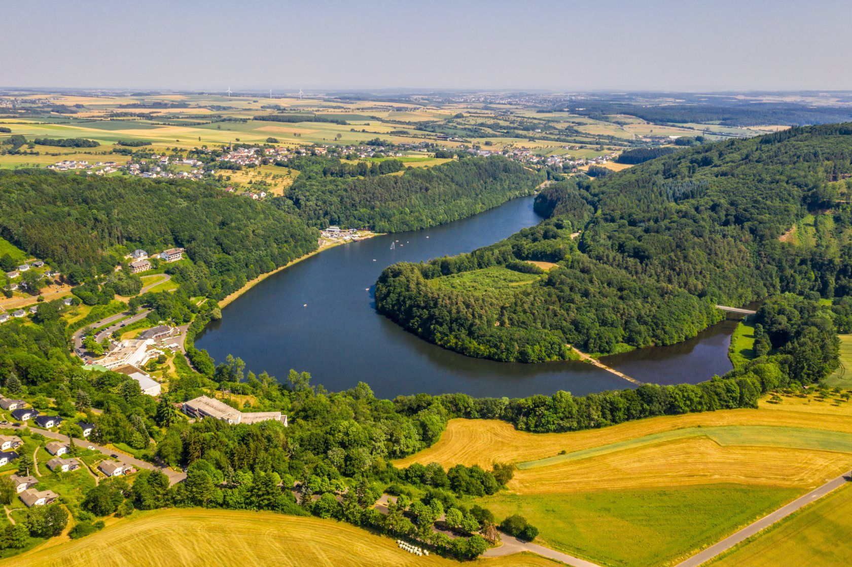 Das Wasser glitzert in der Sonne, eine Fontäne schießt mitten im Stausee Bitburg spritzig in die Höhe und Tretbootfahrer genießen ihre Fahrt im Sonnenschein. Der Beginn der Stausee-Prümtalroute gleicht einem Flanieren am Uferrand. Von dort führt die Wanderung ins geschwungene Tal der Prüm, weg vom lebhaften Treiben hinein in die Ruhe und die Muße.