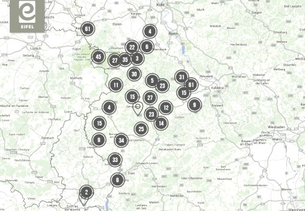 Karte der Eifel mit Übersicht zu Ausflugszielen, Hotels, Fewos, Wanderungen und Radtouren.