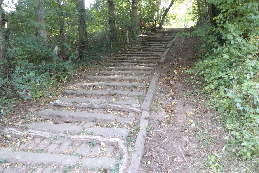 steiler Pfad zum Bahnhof, welcher nach Eröffnung der Eisenbahnstrecke 1871 wie ein kleines Schloss im roten Sandstein erbaut wurde.