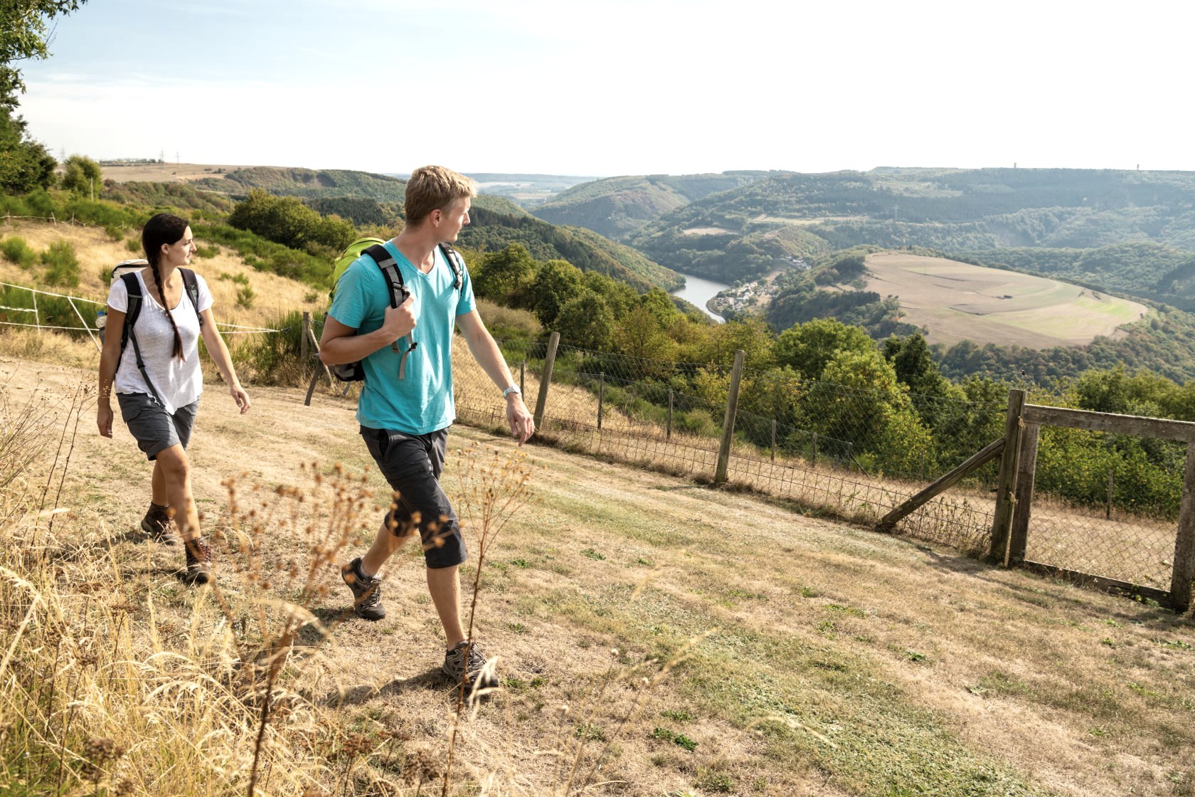Auf dieser faszinierenden Wandertour im NaturWanderPark delux wartet eine grandiose Landschaftskomposition auf euch! Es ist wohl eines der schönsten Postkartenmotive im NaturWanderPark delux, das sich hier vor euch ausbreitet: Die Ourtalschleife etwas nördlich von Vianden. Im Tal liegt der Ort Bivels mit der markanten blauen Brücke, darüber die bewaldete Kuppe mit einer hellgrünen Tonsur, umrundet vom tiefen Blaugrün der breit aufgestauten Our, eingefasst von steil aufstrebenden Eichenwäldern. Und mittendrin die auf einem mächtigen Schiefersporn thronende Ruine Falkenstein. Sie ist die erste, die sich aus dem Nebel schält, wenn die Morgensonne das Ourtal flutet. Auch wenn ihr dem Aufbruch entgegenfiebert, so sucht zur Einstimmung auf die Tour den Aussichtsplatz an der Grillhütte Waldhof-Falkenstein auf – hinreißend! Alternativ könnt ihr die Nat’Our Route von hieraus über einen kurzen Zuweg erreichen und runden, offiziell startet sie in Bivels.