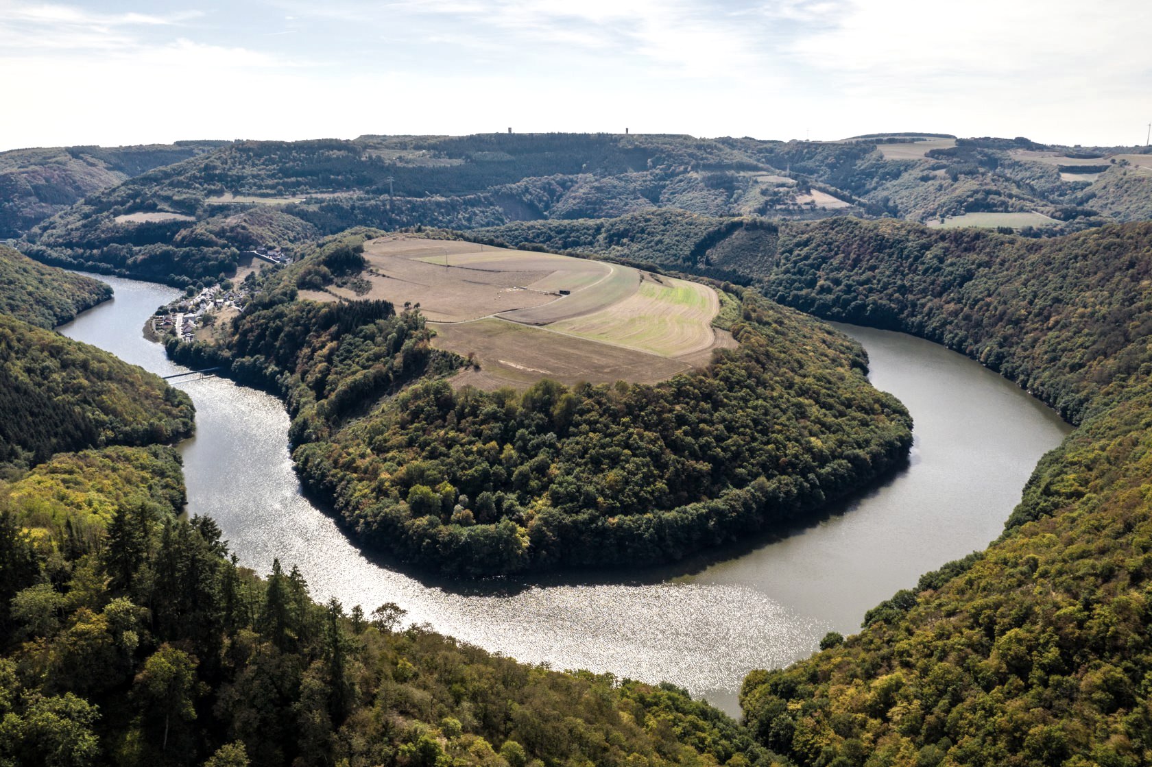 Von dem, was ihr seht, ist viel Menschengemachtes. Bis in die 1950er Jahre zog die Our als kleiner Bach ihre Schleife um Bivels, das damals ganz anders aussah. Der St. Nicolas-Berg gegenüber hatte noch eine richtige Kuppe und es gab noch keinen Stausee. Die Landschaft bezeugt eines der imposantesten Bauprojekte Luxemburgs Mitte des letzten Jahrhunderts. Fast unsichtbar befindet sich hier eines der größten Pumpspeicherkraftwerke Europas. Tief im Fels rauschen die Fluten in Riesenröhren zwischen dem Stausee und dem Oberbecken auf dem Mont St. Nicolas. Viel ältere Bergbaugeschichten erzählt die Kupfergrube in Stolzemburg. Noch viel älter: die Historie der Burg Falkenstein, von der heute noch Wohnhaus und Burgruine erhalten sind.
