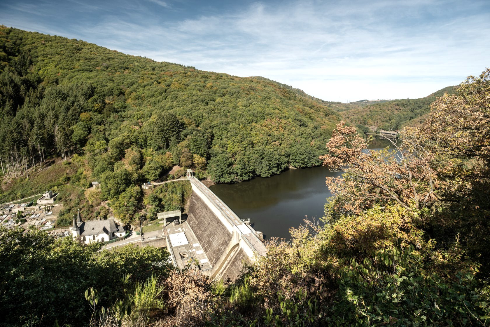 Der Weg führt nun wieder steil bergab zur Talsperre, der ihr ufernah bis Keppeshausen folgt. Dort gelangt ihr – wieder über eine Brücke – nach Stolzemburg auf luxemburgischen Boden. Infos zum Ort, seiner Historie und seiner Burg findet ihr in der täglich geöffneten Infostätte im ehemaligen Zollhäuschen. Gegenüber der Brücke steigt ihr im Ort bergan, biegt links in den Hangwald und gewinnt über Waldpfade rasch an Höhe. Etwa 100 Meter unterhalb des Oberbeckens folgt die weitere Route dem Ourtal – mit sensationellen Blicken über die Talsperre. Ihr kommt in einem Seitental wieder hinunter, wo die Turbine 10 des Pumpspeicherkraftwerks aus dem Berg lugt. Ufernah gelangt ihr dann wieder zurück nach Bivels.