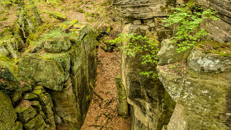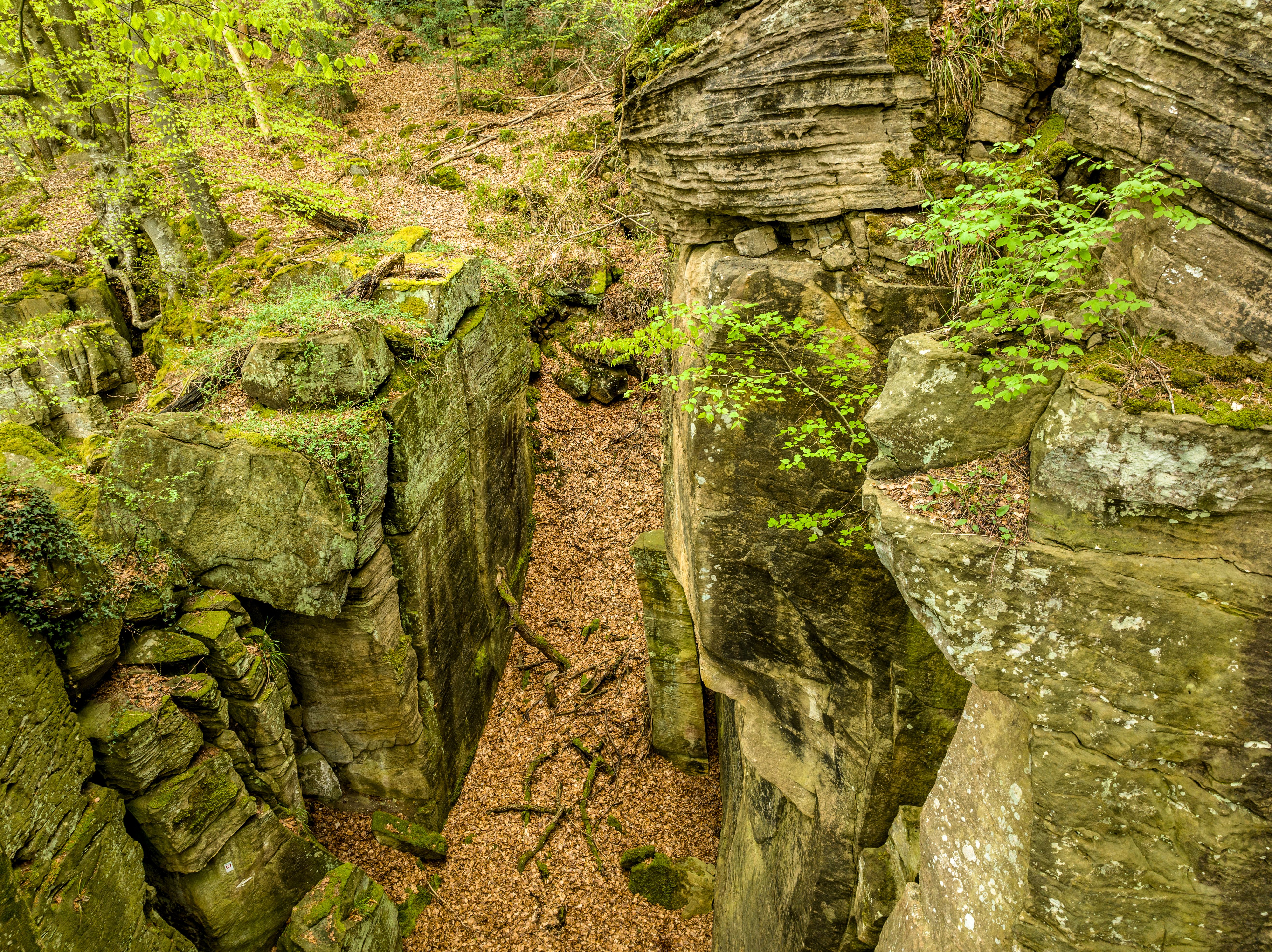 Du bewegst Dich durch ein geologisches Spannungsfeld: das Ferschweiler Plateau auf deutscher Seite, das Berdorfer Plateau auf luxemburgischer, und dazwischen das Tal der Sauer – tief eingeschnitten und voller Überraschungen. Auf etwa 25 Kilometern schlängelt sich der Weg durch enge Felsspalten, vorbei an Aussichtspunkten, über Stege, um Felsbastionen herum. Und wenn sich eine der Schluchten auf gerade mal 40 Zentimeter verengt, wird’s richtig spannend. - Felsenweg 6.