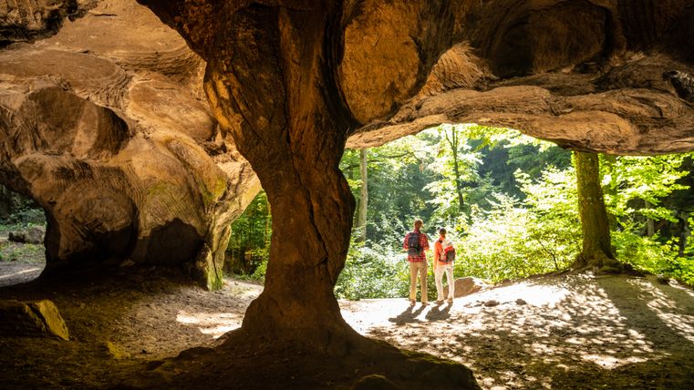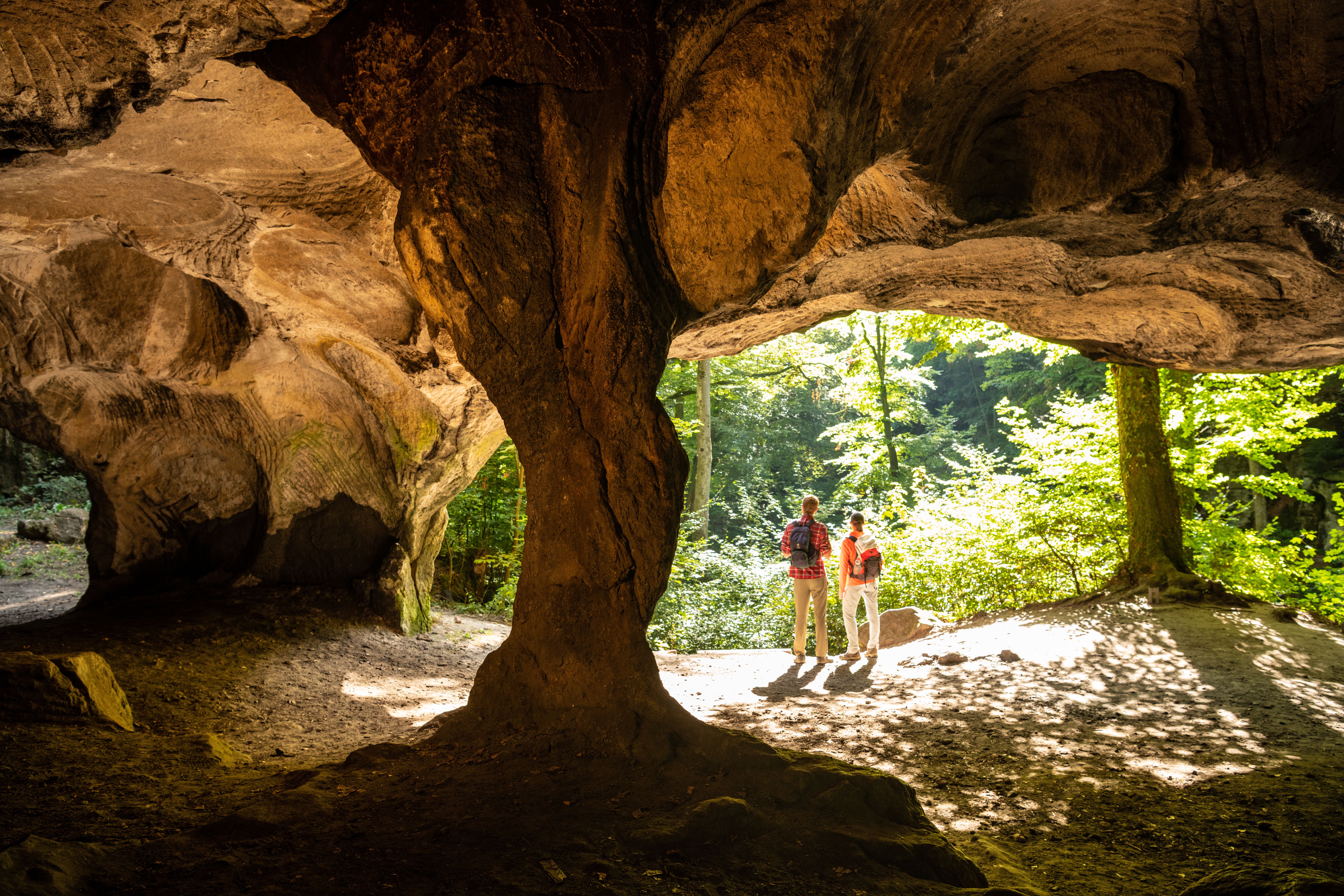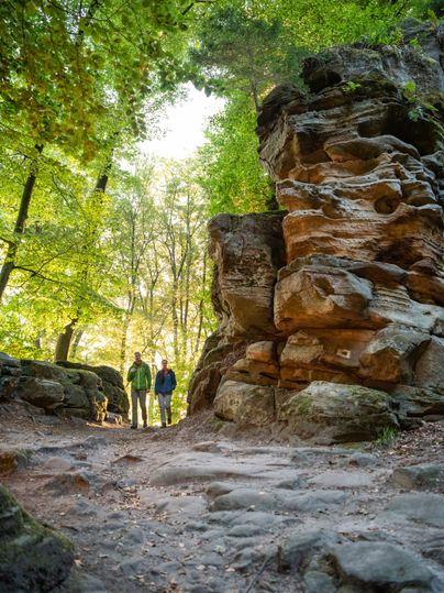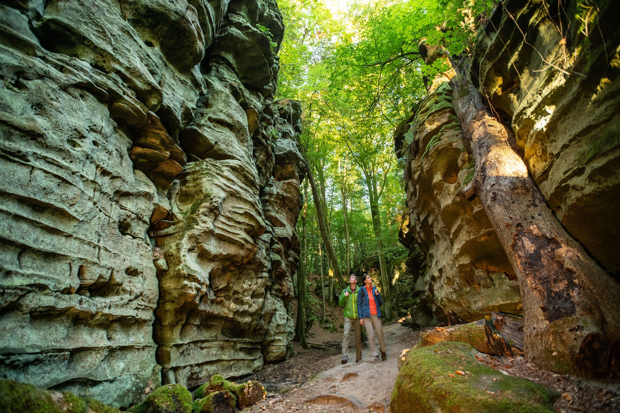 Ganz im Süden des NaturWanderPark delux wartet eine Landschaft, die wirkt, als wäre sie einem Märchenbuch entsprungen. Dort, wo der Luxemburger Sandstein bizarre Felsformen bildet, wird Deine Wanderung zum Abenteuer. Vor rund 190 Millionen Jahren lag hier ein urzeitliches Meer – aus dessen Grund heute 70 Meter hohe Gesteinsformationen emporragen. Kalkhaltiges Bindemittel hat die feinen Sandkörner über Jahrmillionen zu mächtigen Felsblöcken zusammengefügt – und genau zwischen diesen wanderst Du heute.
