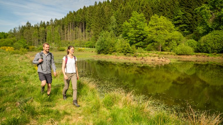 Vier Bäche erzählen auf dieser Rundtour von Geschichte, Natur und Weite. Alfbach, Donsbach, Ihrenbach und Dürenbach begleiten dich durch Bergbauorte, Wiesen und stille Teichlandschaften. - Stausee-Prümtalroute