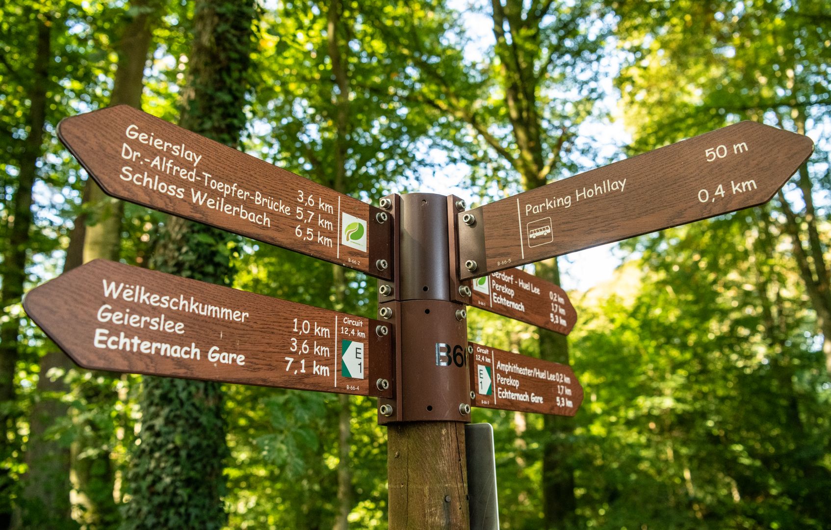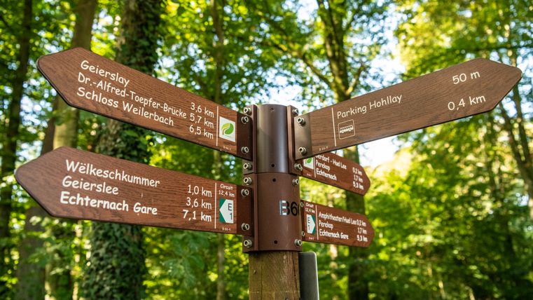 In Luxemburg können die Schilder etwas anders aussehen, zum Beispiel in Form von braunen Holzschildern mit Logo.
